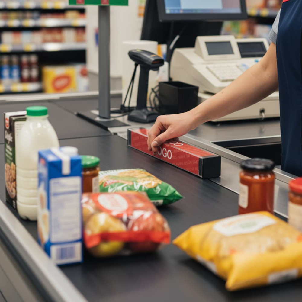 Разделитель покупок, выполненный из прозрачного пластика, внутрь которого помещается вкладыш с рекламным сообщением, нанесенный на плотную бумагу или картон. Благодаря своей конструкции, разделитель долго сохраняет эстетичный внешний вид, а реклама может быть заменена в случае необходимости. В комплект входят пластиковые заглушки.
